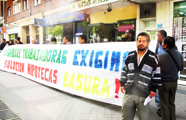 Un grupo de personas se concentró la mañana del miércoles en las puertas del Banco Guipuzcoano de Embajadores, en favor del ciudadano ecuatoriano Julio César Rodríguez, quien es uno de los miles de afectados ecuatorianos por las hipotecas basuras, según señalaron desde la Coordinadora Nacional de Ecuatorianos en España (Conadee), organizadores de la movilización.