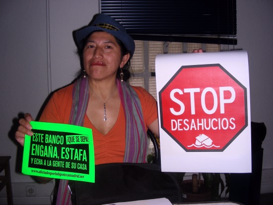 Ella nos cuenta su experiencia en la primera paralización de un desahucio, en el barrio madrileño de Tetuán, impidiendo que el libanés Anuar y su familia fueran desalojados: “La Policía lo primero que dijo “papeles” porque vieron inmigrantes. Pero la mayoría eran españoles que dijeron “claro, aquí están los DNI”. Llegaron al menos 500 personas. Mis compañeros con los banderines, la pancarta, los chicos del 15-M, fue una emoción. Postergaron el desahucio sin fecha. Nos sustentamos legalmente en el artículo 47 de la Constitución Española que establece el derecho a tener una vivienda digna. Estamos haciendo una acción legal, pacífica, cívica, no estamos haciendo nada malo. Ellos deberían tener vergüenza por adónde llevan al país”.
