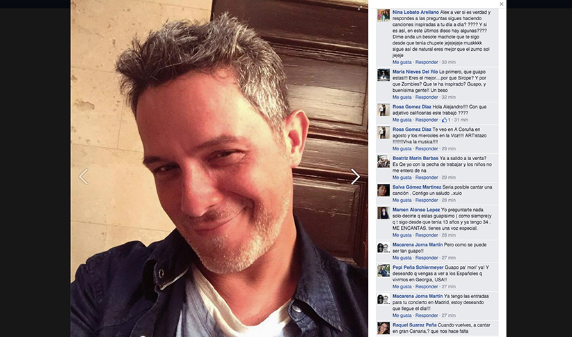 Ocio Latino.- Alejandro Sanz quiere estar en contacto con cada uno de sus seguidores, y así lo publicó en su perfil social de Facebook junto a un selfie, pero tendrá difícil dar respuesta a los 17.485 comentarios de sus fanáticos que, en menos de 24 horas, le han preguntado al pie de su simple fotografía, donde escribió: “Os invito a que me preguntéis todo lo que queráis saber sobre mi nuevo disco “Sirope”. Podéis dejar vuestras preguntas en los comentarios de esta foto y muy pronto las responderé”.