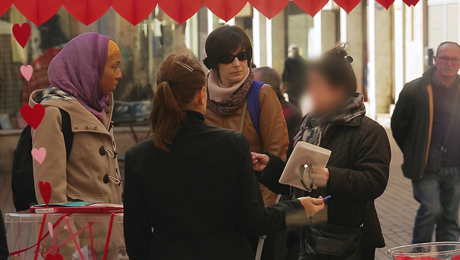Para crear la situación de referencia intervinieron las actrices Meritxell Martínez Bellafont, de la Xixa Teatre, y Adeline Flaun, simulando una discriminación islamófoba; en paralelo y una vez finalizada la escena un grupo de activistas de la asociación desvelaban la artificialidad del hecho explicando el objetivo del spot a las personas que habían vivido el hecho discriminatorio.