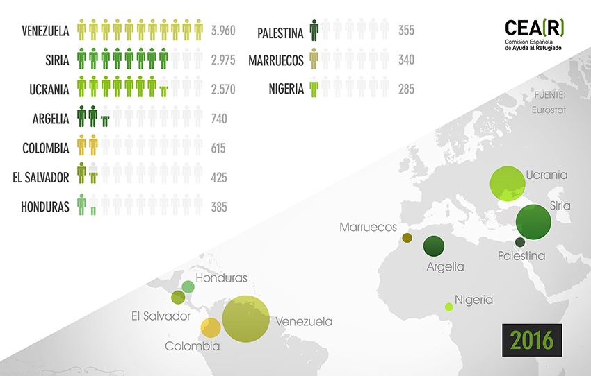 Las peticiones de asilo volvieron a incrementarse en España con un nuevo récord de 15.755 solicitudes en 2016, de las cuales se aceptaron a 6.855 solicitantes, la mayoría sirios (6.215).