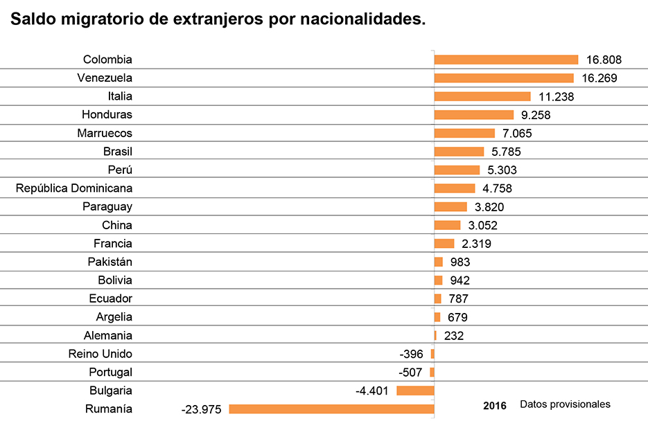 Durante el año 2016 el saldo migratorio de los extranjeros fue de 112.666 personas, positivo por segunda vez consecutiva desde 2010. La población extranjera que inmigró desde otros países aumentó un 22,2% respecto al año 2015, mientras que la emigración extranjera hacia otros países descendió un 3,0%.