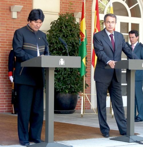 Zapatero aterrizará en La Paz el jueves 2. Es el primer viaje de un presidente español a Bolivia. Allí se reunirá con Evo Morales, Jefe del Estado Boliviano, para “repasar el estado de las relaciones bilaterales” según el Palacio de la Moncloa. Los presidentes suscribirán un acuerdo para facilitar el acceso de empresas españolas a la explotación de litio en Bolivia. En la imagen Zapatero y Morales en el Palacio de la Moncloa durante una visita del presidente Boliviano a Madrid.