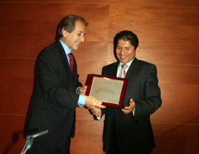 En la foto José Luis Salvatierra recibe la correspondiente placa de reconocimiento de manos del embajador del Perú en España.