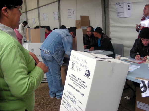 Poco más de un 20% de los 110.000 ecuatorianos empadronados para votar en España en la consulta popular que hoy se celebra en Ecuador ejercieron su derecho ciudadano. Así lo dieron a conocer a las 17:30 horas de hoy Galo Chiriboga, Embajador de Ecuador en España, y Gustavo Mateus, Cónsul General de Ecuador en Madrid, en una rueda de prensa celebrada tras la votación en Madrid.