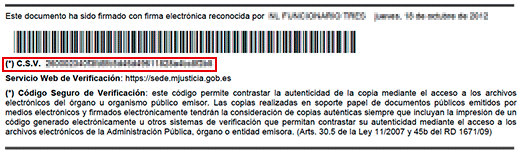 Para identificar de forma segura su expediente de nacionalización en formato electrónico debe proporcionar el Código Seguro de Verificación (CSV, permite comprobar la autenticidad de documentos electrónicos con su firma original) que figura en la parte inferior de su expediente impreso (ver la imagen adjunta)