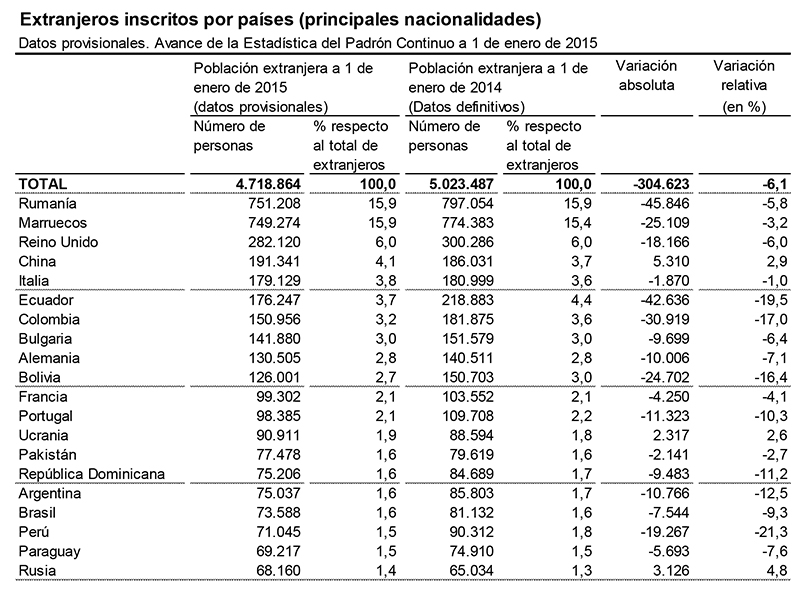 Según los datos publicados, la población latinoamericana se redujo en el Padrón Continuo en 151.010 personas: -42.636 ecuatorianos, -30.919 colombianos, -24.702 bolivianos, -19.267 peruanos, -10.766 argentinos, -9.483 dominicanos, -7.544 brasileños y -5.693 paraguayos, que sumados a las otras nacionalidades, hacen un total de 304.623 extranjeros, que a lo largo de 2014 abandonaron España.