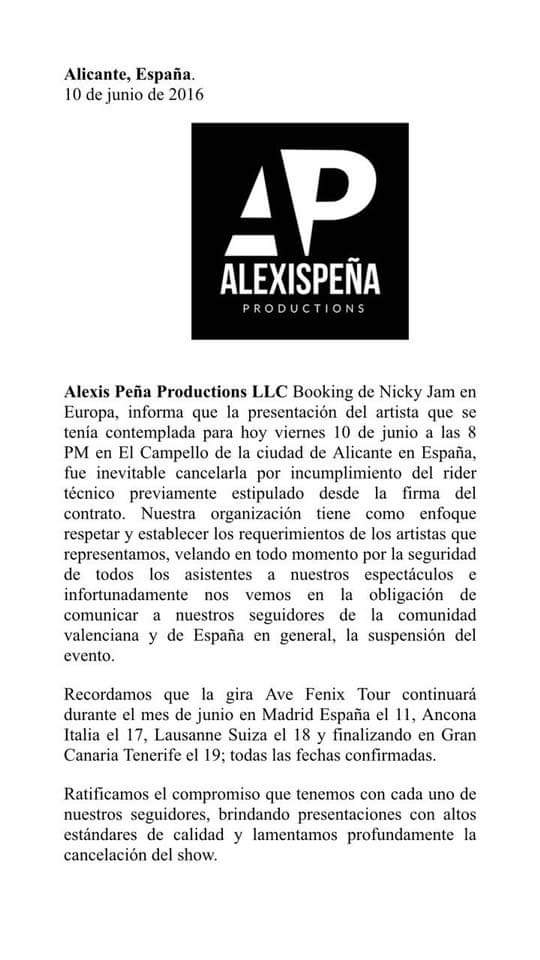Pingback: Álexis Peña Productions también se defiende tras cancelación de concierto de Nicky Jam en Alicante