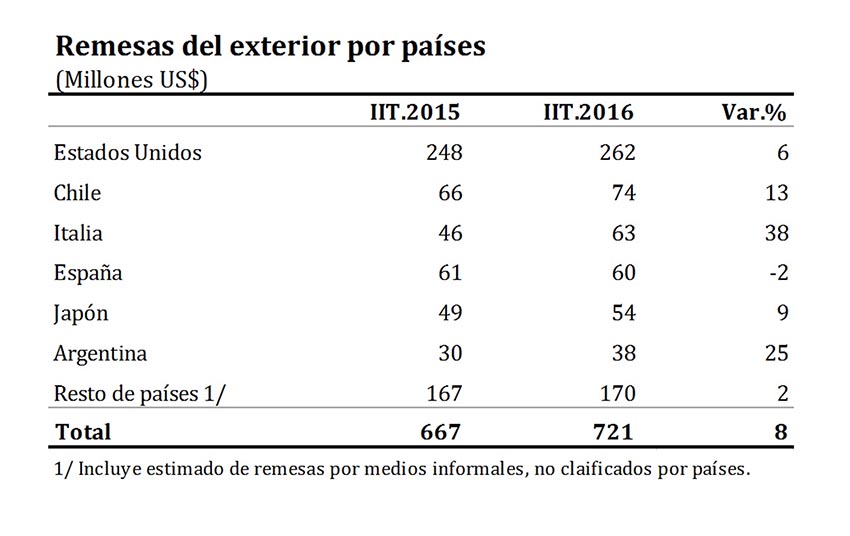 Sin embargo, el total de remesas provenientes desde el exterior ascendieron en 721 millones de dólares en el segundo trimestre de 2016, incrementándose en 8%, la más alta desde hace cinco años, gracias al incremento del envío de dinero de los peruanos que viven en otros países extranjeros.