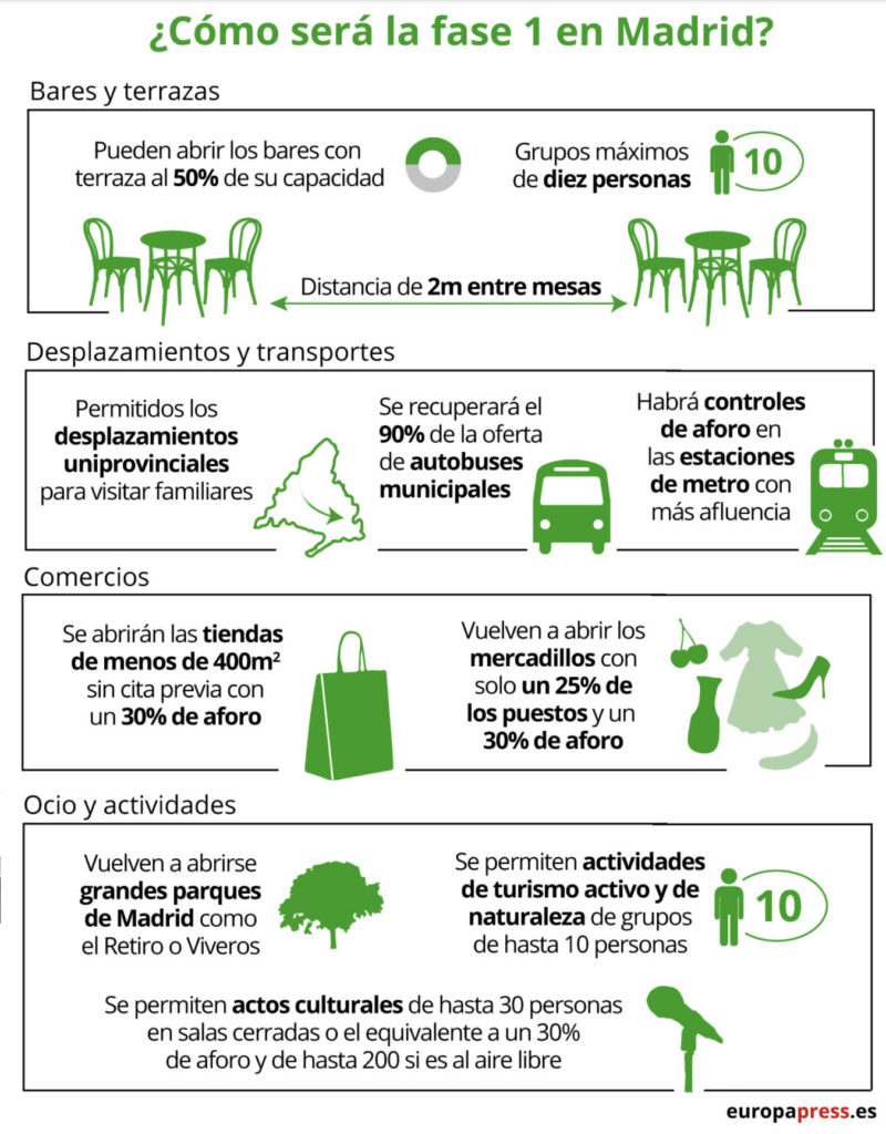 A ello se suma ahora para el caso de Madrid, con la fase uno, las reuniones de un máximo de 10 personas, manteniendo la distancia de seguridad, desplazamientos uniprovinciales para ver a familiares y la reapertura de hoteles y establecimientos turísticos, siempre y cuando las zonas comunes permanezcan cerradas.