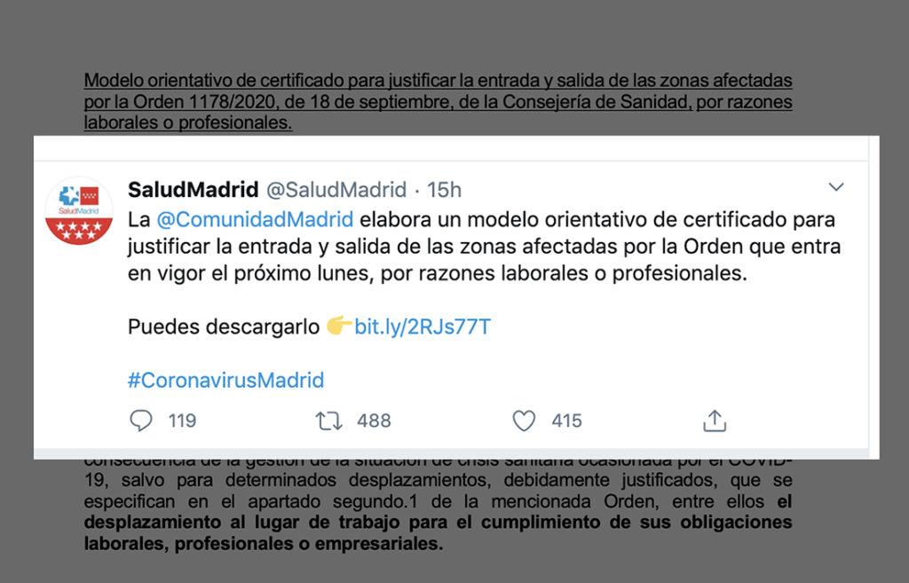 La @ComunidadMadrid elabora un modelo orientativo de certificado para justificar la entrada y salida de las zonas afectadas por la Orden que entra en vigor el próximo lunes, por razones laborales o profesionales.