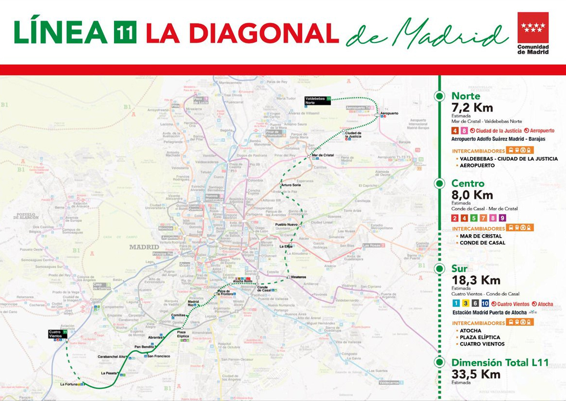 El proyecto de la nueva línea Diagonal de Madrid se hará por fases e integrará las ampliaciones ya previstas de la línea 11 de Metro, de Plaza Elíptica al futuro intercambiador de Conde de Casal; y la llegada del Metro a los nuevos desarrollos de Valdebebas.