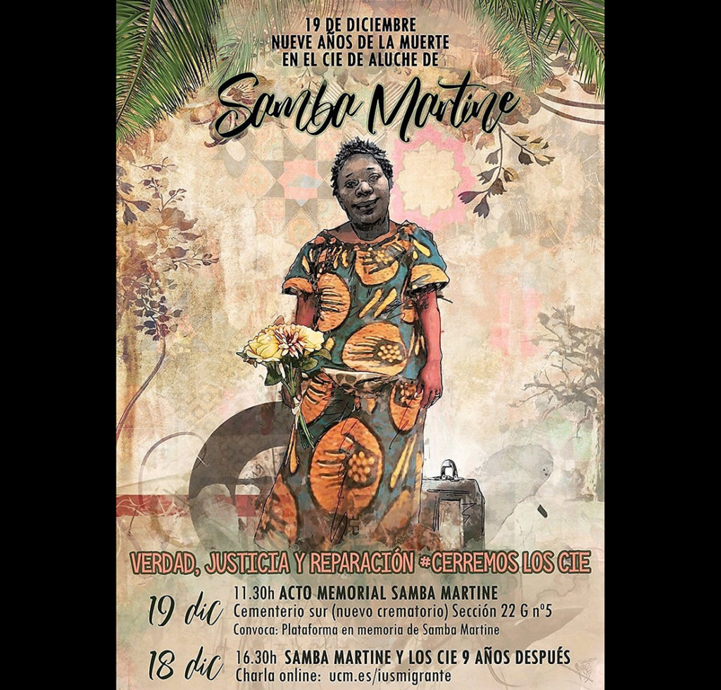 El sábado 19 de diciembre desde las 11:30 horas los convocantes asistirán a un acto memorial al Cementerio Sur (Sección 22 G no 5) para rendir homenaje a la memoria de Samba Martine en el noveno aniversario de su fallecimiento “y un mes después de que el Estado español reconociera la responsabilidad patrimonial que tenía en su muerte, por el mal accionar del Ministerio de Interior, el Ministerio de Migraciones y la empresa que prestaba el servicio médico en el CIE de Aluche, Sermedes S.L.”.