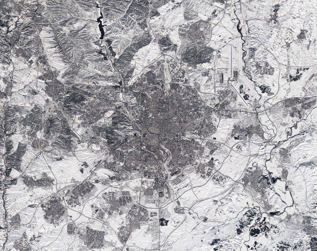 Aunque esta imagen por satélite fue tomada una vez que la borrasca había pasado, es evidente que aún queda mucha nieve, especialmente en las afueras de la ciudad.