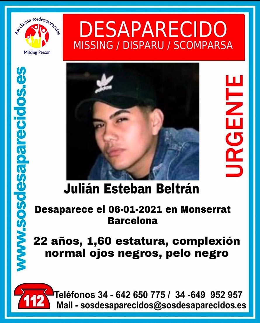 Julián Esteban Beltrán, el joven desaparecido el pasado 6 de enero en Montserrat, Barcelona, continúa en paradero desconocido. Un video de su madre Lilian Rivera ha llegado a nuestra redacción que clama por su hijo desaparecido que vino a buscar una nueva vida en España.