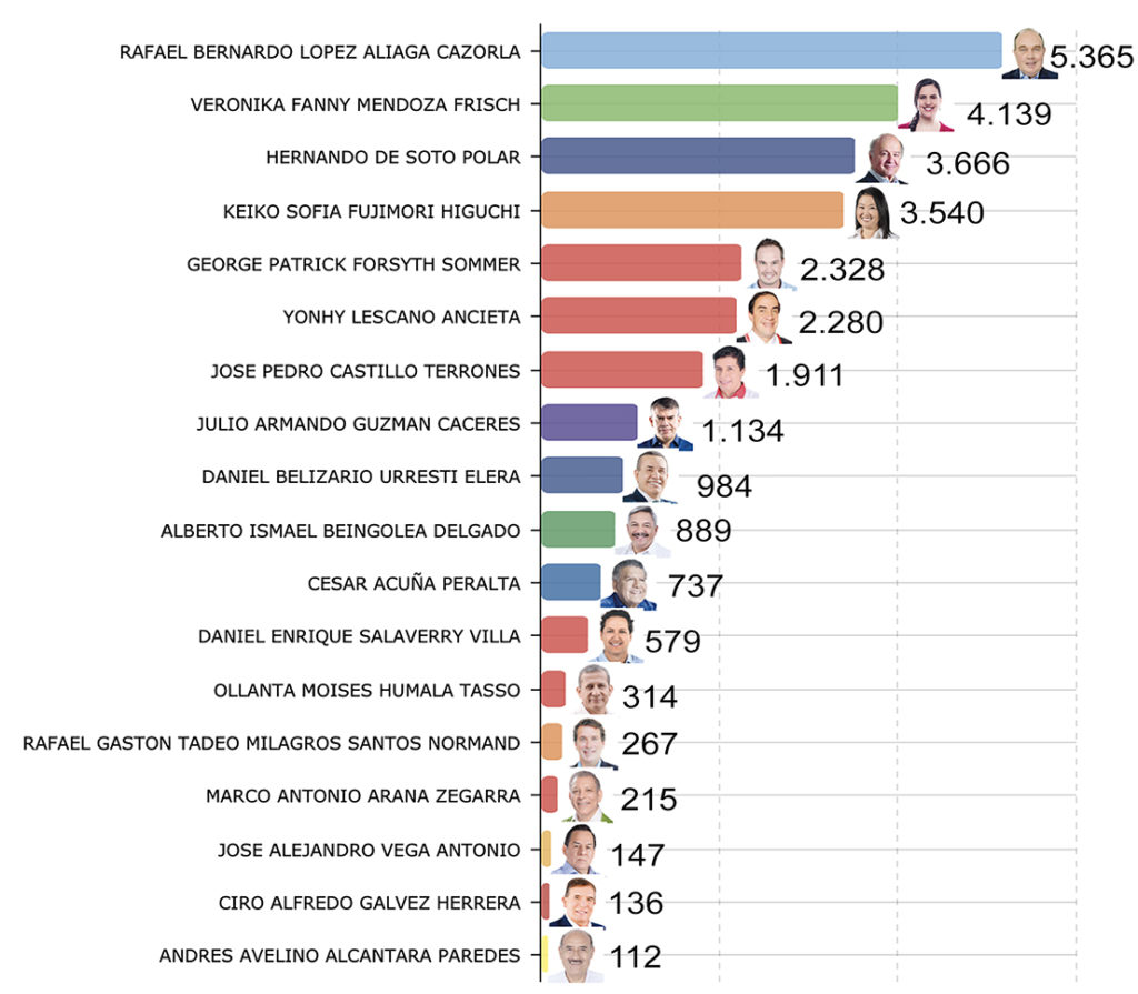 El primer lugar de los votos fue para Rafael López Aliaga (Renovación Popular) con 5.365 votos. El segundo lugar lo ocupa Verónica Mendoza (Juntos por el Perú) con 4.139 votos. Le sigue Hernando de Soto (Avanza País) con 3.666. El cuarto lugar es para Keiko Fujimori (Fuerza Popular) con 3.540 votos. El candidato George Forsyth (Victoria Nacional) ocupa el quinto lugar con 2.328, seguido muy de cerca de Yonhy Lescano (Acción Popular) con 2.280; mientras el candidato que ocupó el primer lugar en Perú, Pedro Castillo (Perú Libre) solo consiguió 1.911 votos.