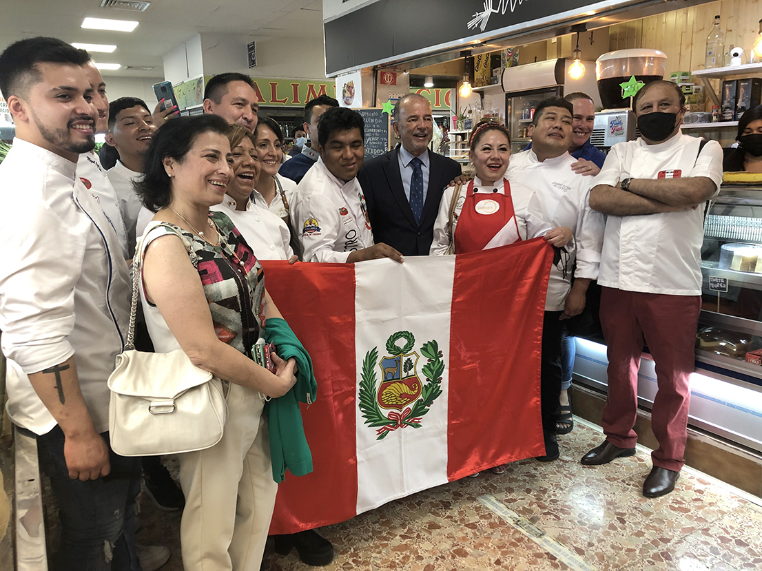 Con motivo de esta emblemática fecha, hoy 1 de julio, el Embajador de Perú Claudio De la Puente y un nutrido número de chef de algunos restaurantes peruanos afincados en Madrid han visitado el Mercado de los Mostenses, un mercado céntrico, cerca del Metro Plaza España, donde los puestos de comida y productos peruanos son numerosos y se mezclan con los comercios de este tradicional mercado español.