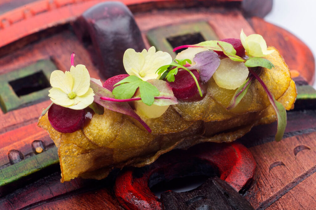“El Aya Huma es un personaje que ahuyenta los malos espíritus de la cosecha en el mes de junio utilizando un rabo de toro. Un producto importante de esa cosecha es la papa de la sierra ecuatoriana. Por ello, y al estar ante un jurado español, elegí presentar una tapa en la que fusioné productos y sabores de las dos culturas. Mi propuesta fue un guiso de rabo de toro presentado dentro de un barquillo crujiente de papa leona, una variedad que se cultiva en las provincias de Pichincha, Cotopaxi y Tungurahua, que finalmente aderecé con un gel de manzana, alioli de remolacha y una crema ahumada de chocolate fino de aroma ecuatoriano”, resume Juan Pablo.