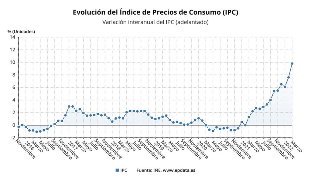 El Índice de Precios de Consumo (IPC) subió un 3% en marzo en relación al mes anterior y elevó de golpe su tasa interanual más de dos puntos, hasta el 9,8%, su valor más alto en 37 años, concretamente desde mayo de 1985.