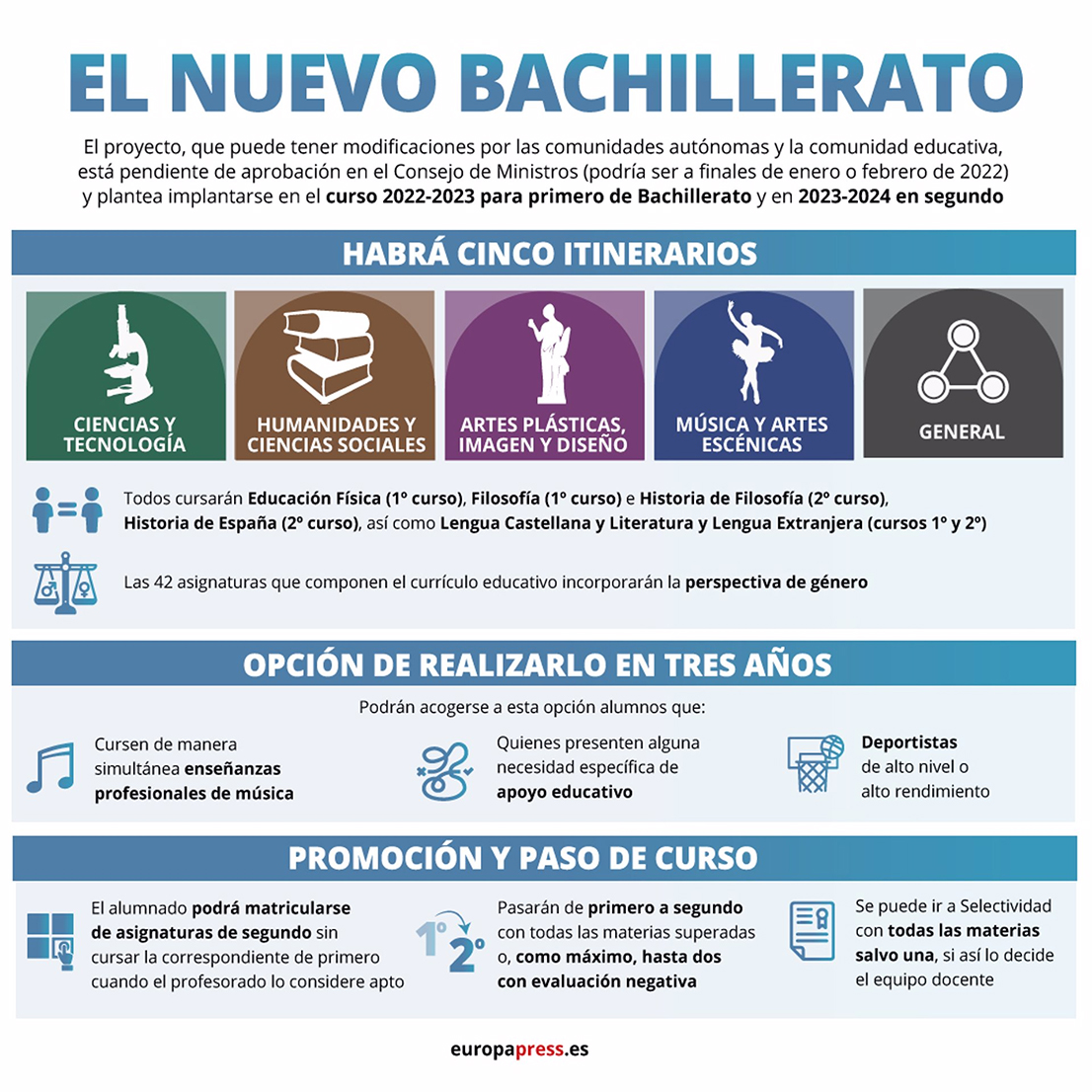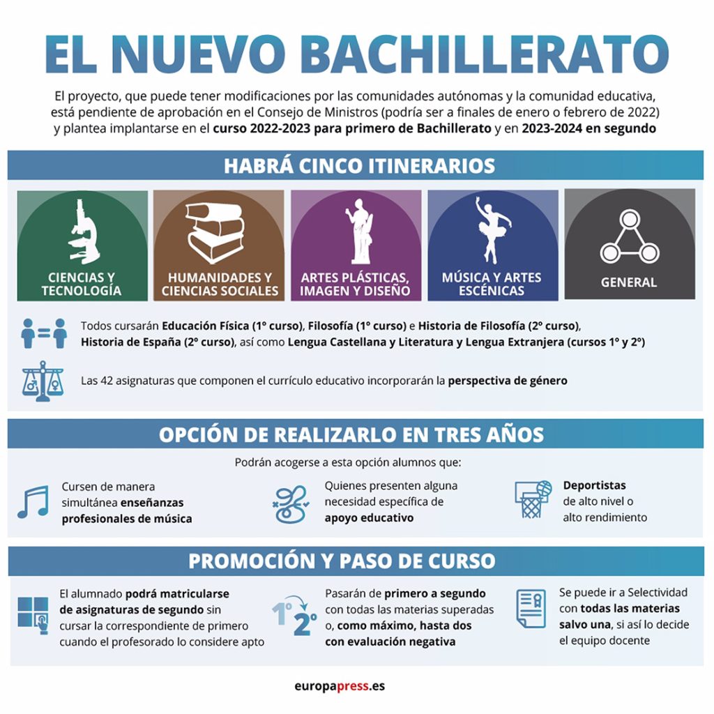 El Consejo de Ministros aprobó este martes, a propuesta del Ministerio de Educación y FP, el Real Decreto por el que se establece la ordenación y las enseñanzas mínimas de Bachillerato, que desarrolla la ley educativa, la LOMLOE, según han informado a Europa Press en fuentes gubernamentales. Estos cambios se implantarán en el año académico 2022-2023 para 1º de Bachillerato y en el curso 2023-2024 para el 2º curso.