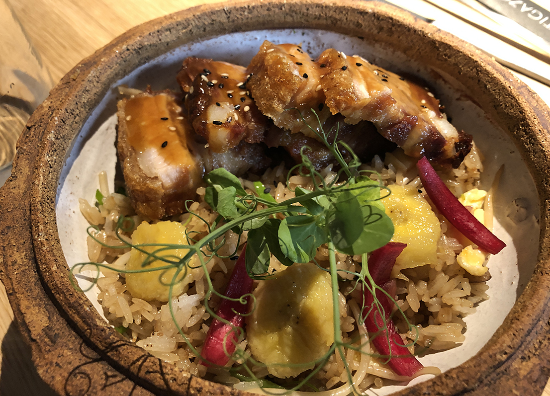 Como platos principales elegimos el Gohan Nikei, basado en el clásico arroz chaufa servido con piezas de cerdo muy crocantes. También probamos el Kaen, la versión del chef del tradicional Lomo Saltado, servido junto a patatas fritas y arroz con granos de choclo.