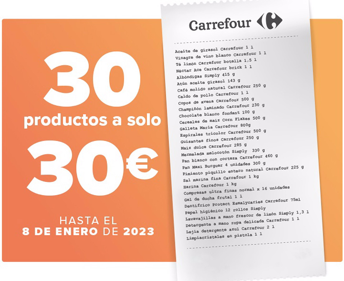 Carrefour ha incluido en su cesta de 30 productos por 30 euros productos como sal, harina, aceite de oliva, galletas, café o pan de molde, entre otros, según ha publicado la multinacional francesa en su página web.