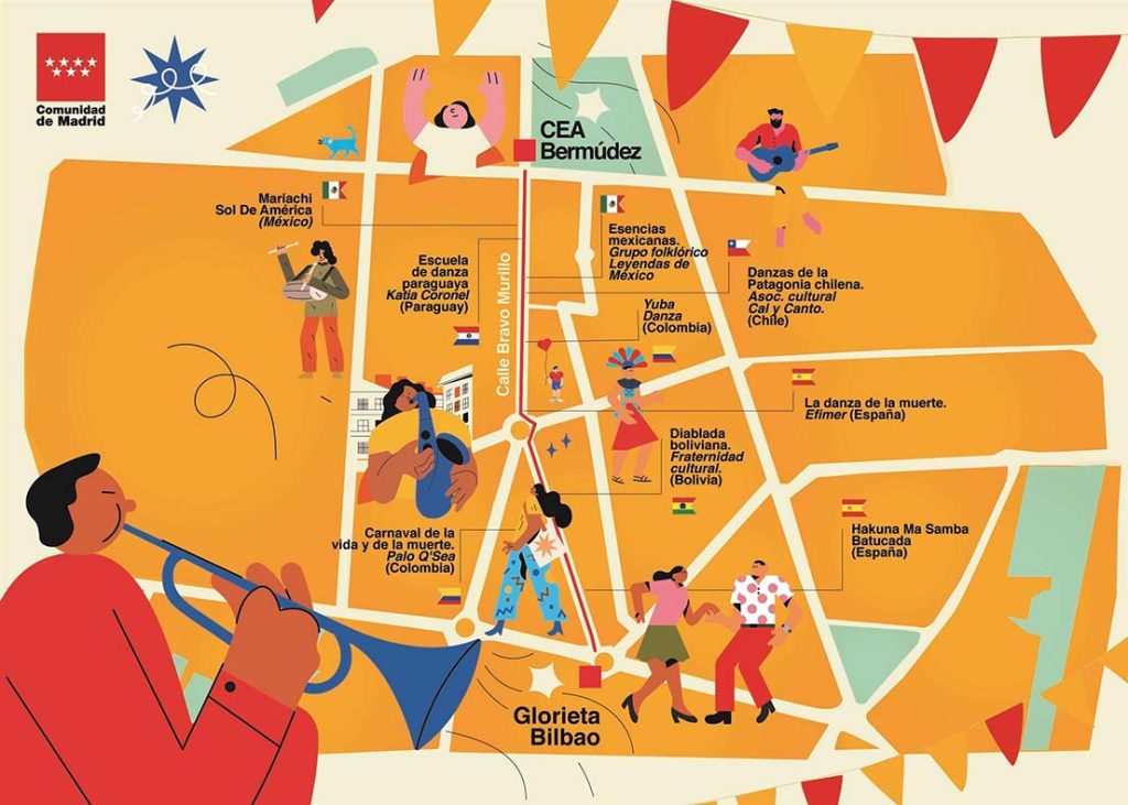 La Comunidad de Madrid, en el marco de la programación de Hispanidad 2022, acogerá este sábado una cabalgata en la que alrededor de 150 artistas procedentes de países como Bolivia, Chile, Colombia, Paraguay, México y España realizarán una exhibición del folclore de las culturas hispanas a lo lardo de la calle Bravo Murillo, entre Cea Bermúdez y la Glorieta de Bilbao, a partir de las 18.30 horas.