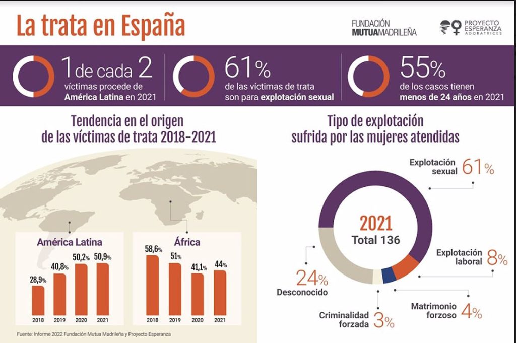 En el último año, Proyecto Esperanza detectó 136 casos de víctimas de trata, de las cuales 126 eran mujeres, 2 varones y 6 menores a cargo de sus madres. Seis de cada diez casos registrados (61%) fueron captadas y explotadas para fines sexuales y un 72% de las víctimas tenía menos de 24 años en 2018, un porcentaje que se ha ido reduciendo hasta el 55% en 2021.