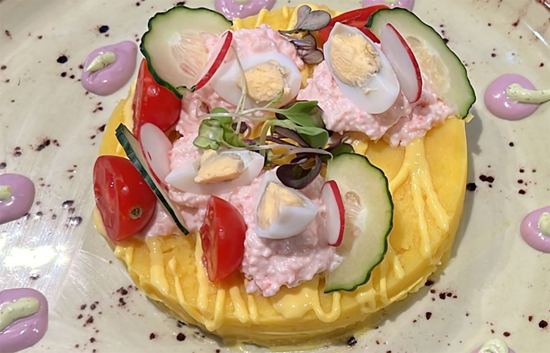 O la Causa de Cangrejos, que consiste en la tradicional patata prensada con los aliños peruanos, acompañado de pulpa de cangrejo, tomate Cherry, huevo de codorniz, mayonesa de aguacate, flores y salsa huancaína.