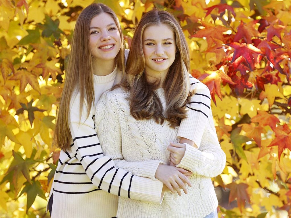 Sobre un fondo repleto de hojas amarillas y rojizas propias del otoño, las hermanas derrochan cercanía y cariño, presumiendo de su belleza natural con looks informales acordes a su edad; así, mientras Leonor luce unos vaqueros y un jersey de ochos en color crema, Sofía se decanta por pantalones negros y suéter de rayas marineras. Si en algo coinciden las hermanas es en sus largas melenas sueltas, aunque la Princesa apuesta por unas ondas abiertas para dar volumen a su pelo, y la Infanta prefiere llevarlo totalmente liso.