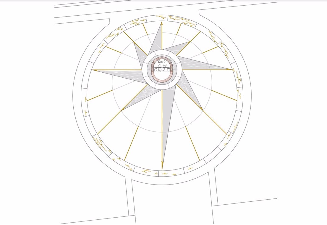 El círculo que envolverá la placa se ha diseñado como una rosa de los vientos, símbolo que marca los rumbos, y que se relaciona de forma directa con el significado del km0, origen virtual de los mismos ya que el kilómetro es el origen de las carretas radiales nacionales.