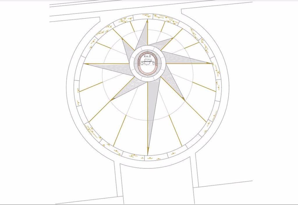 El círculo que envolverá la placa se ha diseñado como una rosa de los vientos, símbolo que marca los rumbos, y que se relaciona de forma directa con el significado del km0, origen virtual de los mismos ya que el kilómetro es el origen de las carretas radiales nacionales.