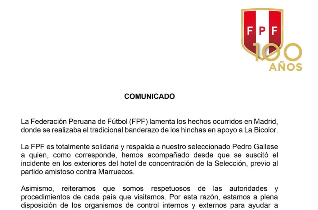 “La Federación Peruana de Fútbol lamenta los hechos ocurridos en Madrid, donde se realizaba el tradicional banderazo de los hinchas en apoyo de La Bicolor. La FPF es totalmente solidaria y respalda a nuestro seleccionado Pedro Gallese, a quien, como corresponde, hemos acompañado desde que se suscitó el incidente en los exteriores del hotel de concentración de la selección, previo al partido amistoso contra Marruecos”, señaló la FPF en un comunicado.