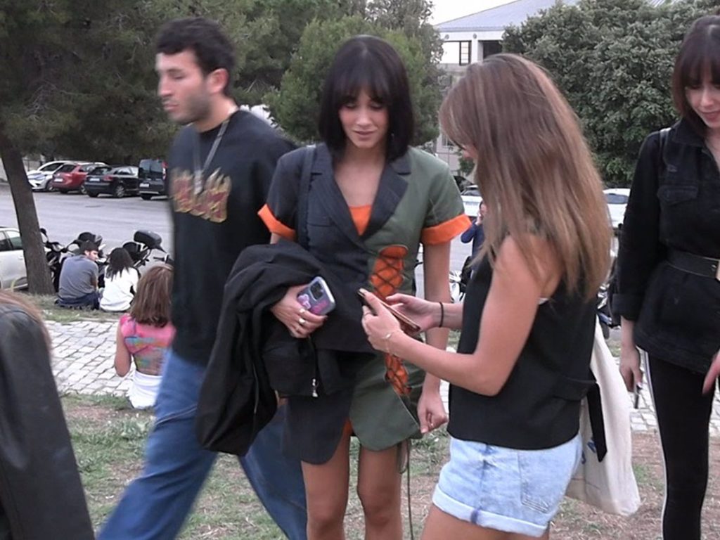 Segundos después y con una sonrisa tímida era su chica la que accedía al recinto con su pandilla, acaparando todas las miradas con un original minivestido americana en naranja, verde y negro, con la espalda al aire y detalle de cordones en la parte delantera. Guapísima con el corte bob francés con el que sorprendió hace unos días diciendo adiós a su característica melena, Aitana no pudo ocultar su nerviosismo minutos antes de disfrutar, con Yatra, de uno de sus grupos favoritos./ Europa Press