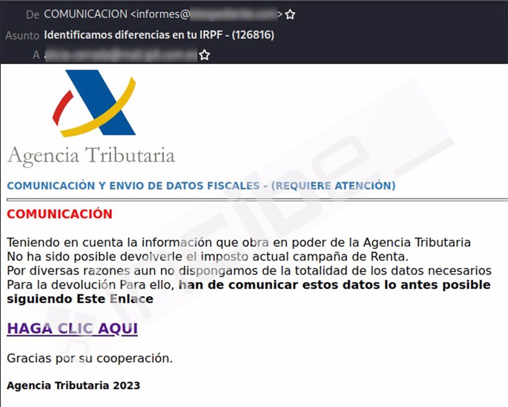 El pretexto del mensaje de los estafadores es la necesidad de corregir unos datos, ya que se ha identificado una diferencia en el IRPF. El correo va acompañado de un enlace, el cual descarga un archivo comprimido que contiene un ejecutable (archivo.exe) con un código fraudulento.