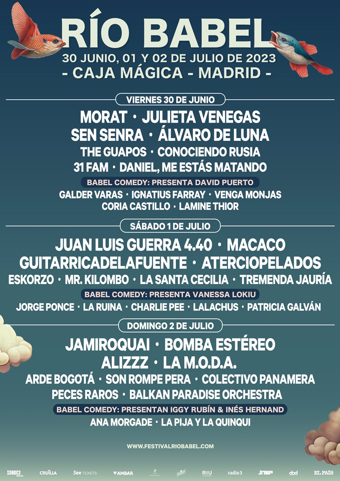 El festival Río Babel vuelve este año a programar a grandes humoristas como Ignatius Farray y Ana Morgades junto a un elenco musical de la talla de Jamiroquai, Morat o Juan Luis Guerra, un evento que se celebrará entre hoy viernes y el domingo 2 de julio en la Caja Mágica de Madrid.