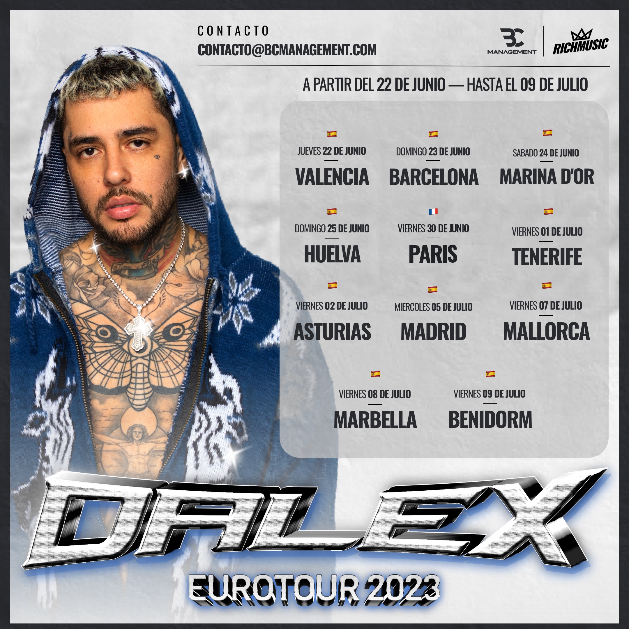 Los fans de Dalex están también de enhorabuena. El artista va a llenar de ritmos urbanos múltiples ciudades de España este verano. Comenzará el 22 de junio en Valencia y continuará por Barcelona, Marina D’Or, Huelva, Tenerife, Asturias, Madrid, Mallorca, Marbella y Benidorm. También visitará París el 30 de junio. El tour finalizará el 9 de julio.