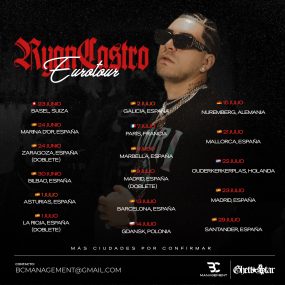 Por su parte, el colombiano Ryan Castro dará el salto a otros países del continente. Comenzará el 23 de junio en Suiza y continuará por Francia, Alemania, Holanda, España y Polonia. En el caso de España, visitará Galicia, Marina D’Or, Mallorca, Zaragoza, Marbella, Bilbao, Madrid, Asturias, Barcelona, La Rioja y Santander. Se despedirá de la gira el 29 de julio.