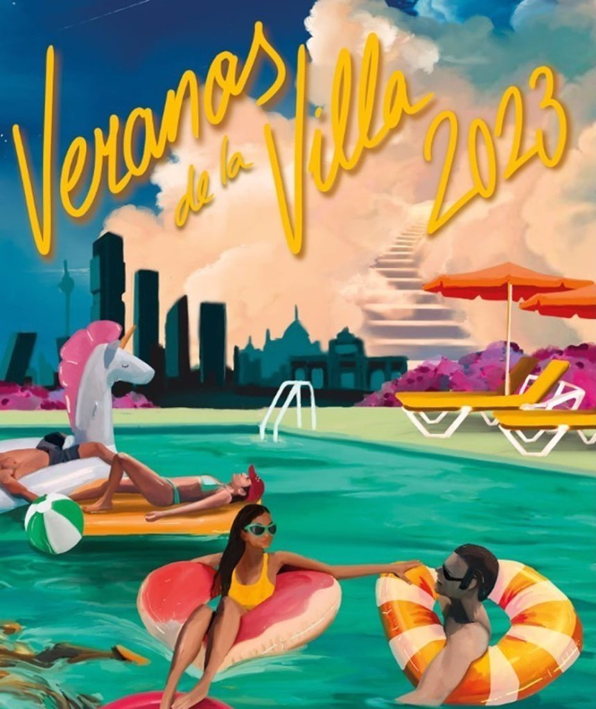 La artista multidisciplinar Amanda Portillo (Madrid, 1988) es la encargada de ponerle imagen a esta edición de Veranos de la Villa. El significado del cartel está basado en su propia experiencia, pues Portillo afirma que “como buena madrileña, estoy enamorada de los veranos en Madrid y me gusta pasarlos en la ciudad”. Los tonos representan una ciudad en la que anochece y comienza a refrescarse el entorno. La escena se sitúa en una piscina infinita inspirada en las tantas que existen en las azoteas de los hoteles del centro de la capital y desde las que se puede disfrutar del cielo madrileño, haciendo así hincapié, junto a las escaleras celestiales, en el conocido dicho “De Madrid al cielo”. Además, se añade a la imagen el aire festivo de los personajes que aparecen, dibujados así para representar el ocio que se puede encontrar en la ciudad durante la etapa estival, sobre todo, en las actividades de los Veranos de la Villa.