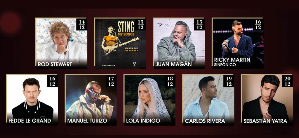 Christmas by Starlite ofrecerá conciertos únicos de artistas internacionales como Rod Stewart (jueves 14 de diciembre), Sting (viernes 15 de diciembre), Ricky Martin (sábado 16 de diciembre), Manuel Turizo (domingo 17 de diciembre), Lola Índigo (lunes 18 de diciembre), Carlos Rivera (martes 19 de diciembre) o Sebastián Yatra (miércoles 20 de diciembre). Una oportunidad sin precedentes para disfrutar en directo de estrellas mundiales más cerca que nunca.