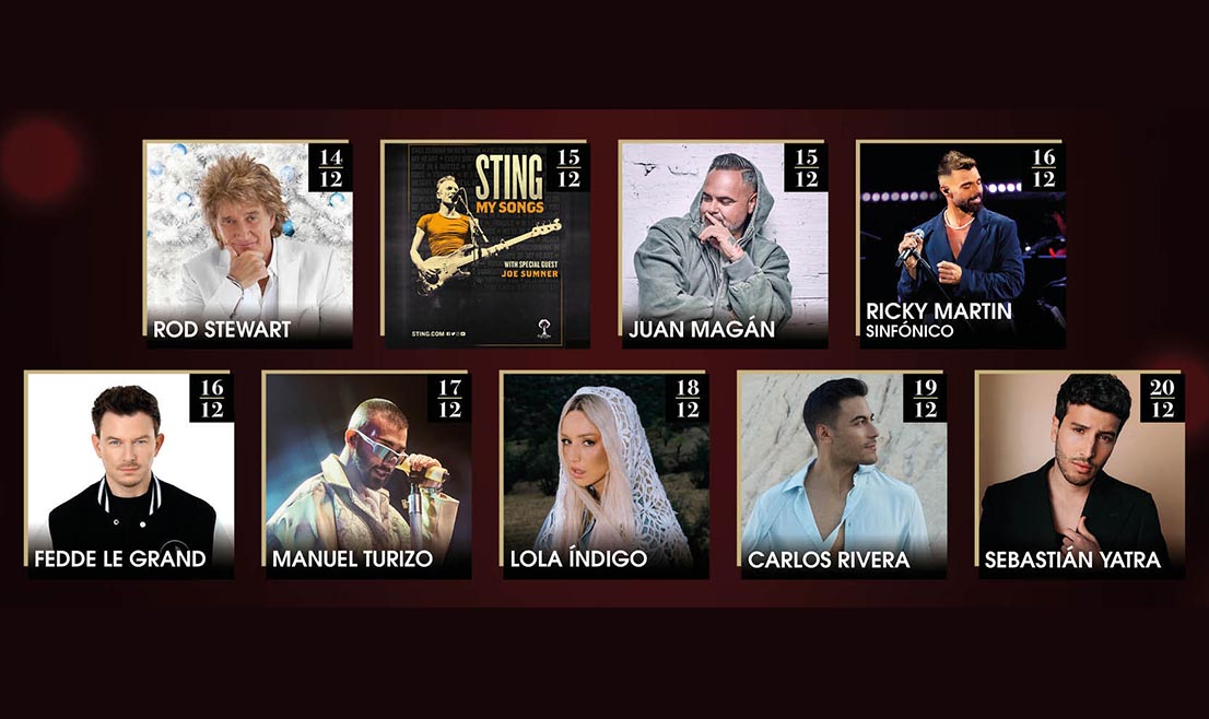 Grandes artistas internacionales como Rod Stewart (jueves 14 de diciembre), Sting (viernes 15 de diciembre), Ricky Martin (sábado 16 de diciembre), Manuel Turizo (domingo 17 de diciembre), Lola Índigo (lunes 18 de diciembre), Carlos Rivera (martes 19 de diciembre) o Sebastián Yatra (miércoles 20 de diciembre), se darán cita en Christmas by Starlite. Una oportunidad única para disfrutar de las estrellas en directo más cerca que nunca.
