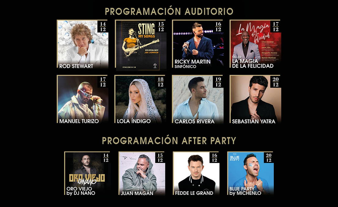 Christmas by Starlite ofrecerá conciertos únicos de artistas internacionales como Rod Stewart (jueves 14 de diciembre), Sting (viernes 15 de diciembre), Ricky Martin (sábado 16 de diciembre), Manuel Turizo (domingo 17 de diciembre), Lola Índigo (lunes 18 de diciembre), Carlos Rivera (martes 19 de diciembre) o Sebastián Yatra (miércoles 20 de diciembre). Una oportunidad sin precedentes para disfrutar en directo de estrellas mundiales más cerca que nunca.