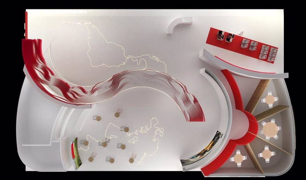 La propia estructura del stand representa esa unión entre Europa y América Latina, pues una pared curva a modo de puente atraviesa el expositor y, en cada uno de sus huecos, se encuentran insertados mensajes que informan sobre los propósitos y novedades de la compañía.