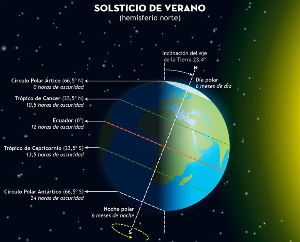 El solsticio de verano ocurre cuando el Sol alcanza la máxima declinación (mínima en el solsticio de invierno desde el hemisferio norte), proyectando su luz sobre la máxima latitud geográfica en la Tierra.