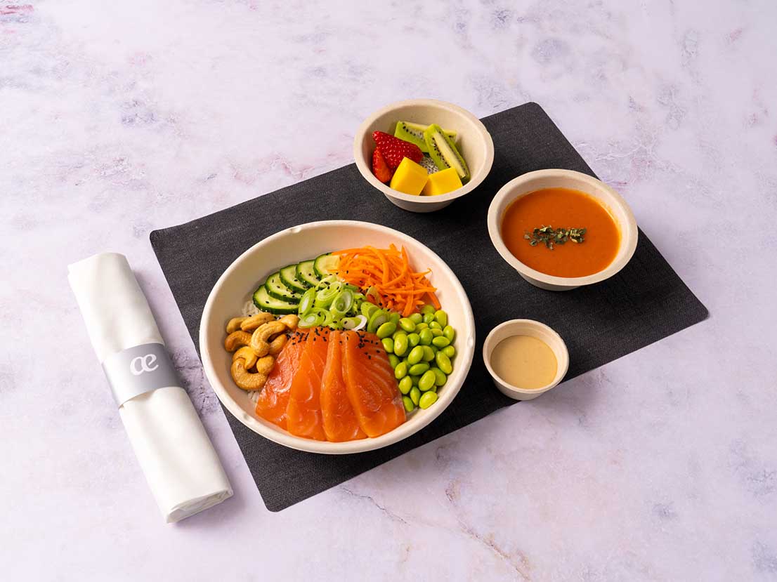 Los Menús fuera de carta, que deben ser contratados previamente al viaje, permiten a los pasajeros saborear platos de alta calidad, elaborados con productos frescos y de temporada. Además, se presentan en envases biodegradables, reflejando el compromiso de Air Europa con la sostenibilidad.