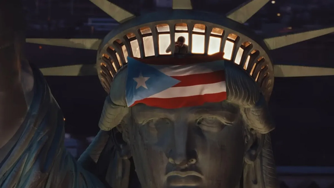 ‘Nuevayol’ también ofrece una reflexión sobre el estatus político de Puerto Rico. En una de las escenas más simbólicas, aparece la Estatua de la Libertad luciendo la bandera puertorriqueña en la frente, pero con el azul cambiado al tono celeste, característico de los sectores que rechazan la integración total de la isla como estado de EE.UU.
