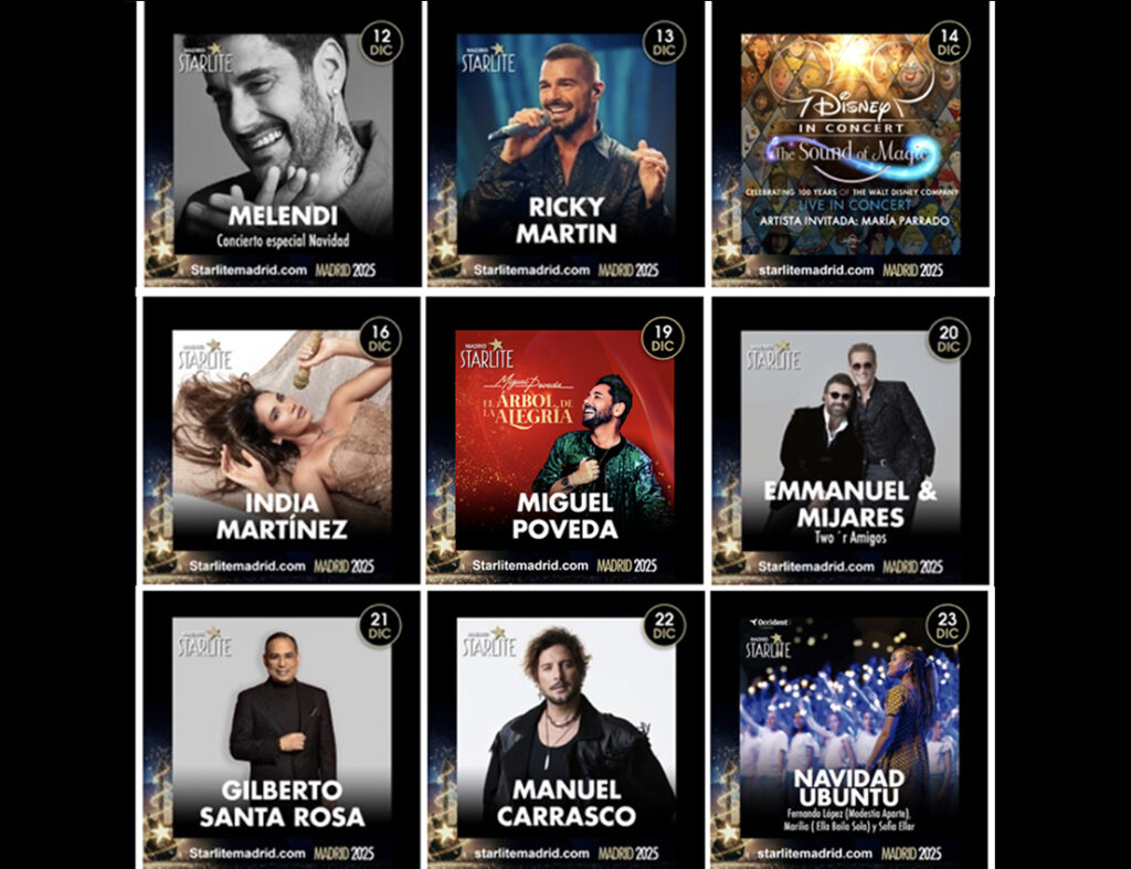 El cartel de STARLITE Madrid 2025 reúne a algunos de los nombres más destacados de la escena musical nacional e internacional, con una programación que celebra la diversidad de estilos y géneros. Entre los artistas confirmados se encuentran Melendi (12 de diciembre), Ricky Martin (13 de diciembre), India Martínez (16 de diciembre), Miguel Poveda (19 de diciembre), Emmanuel y Mijares (20 de diciembre), Gilberto Santa Rosa (21 de diciembre) y Manuel Carrasco (22 de diciembre), entre otros. También tendrán lugar espectáculos para los más pequeños: Disney in Concert: The Sound of Magic (14 de diciembre) y Navidad Ubuntu (23 de diciembre).