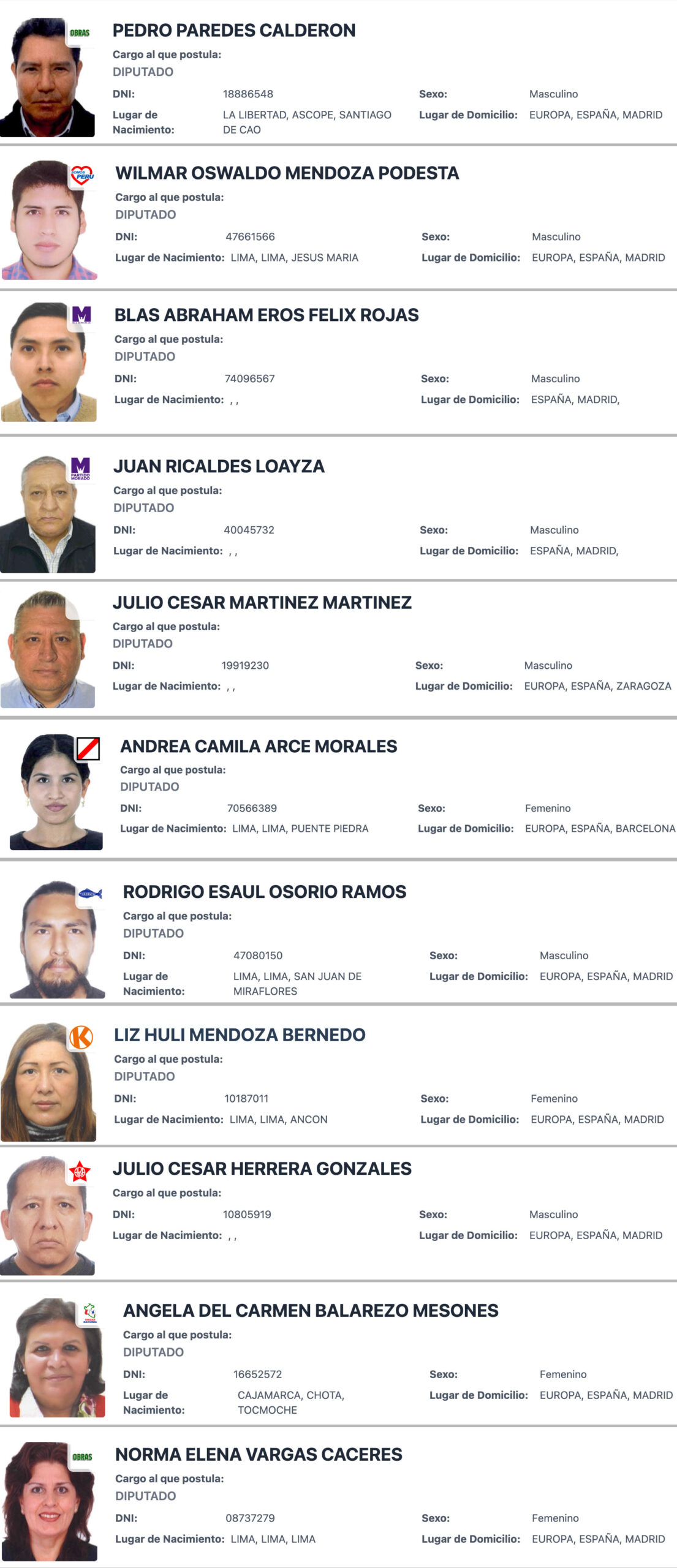 Según las hojas de vida presentadas ante el Jurado Nacional de Elecciones (JNE), once candidatos residentes en España se presentan a esta contienda electoral dejando un panorama variopinto donde resalta la ausencia de profesionales de las leyes (solo una candidata).