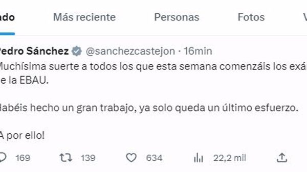 El presidente del Gobierno, Pedro Sánchez, ha deseado suerte en Twitter a los estudiantes que se enfrentan a partir de esta semana a los exámenes de la convocatoria de la Evaluación del...
