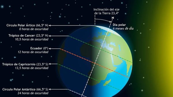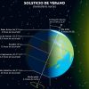El solsticio de verano ocurre cuando el Sol alcanza la máxima declinación (mínima en el solsticio de invierno desde el hemisferio norte), proyectando su luz sobre la máxima latitud geográfica en la...